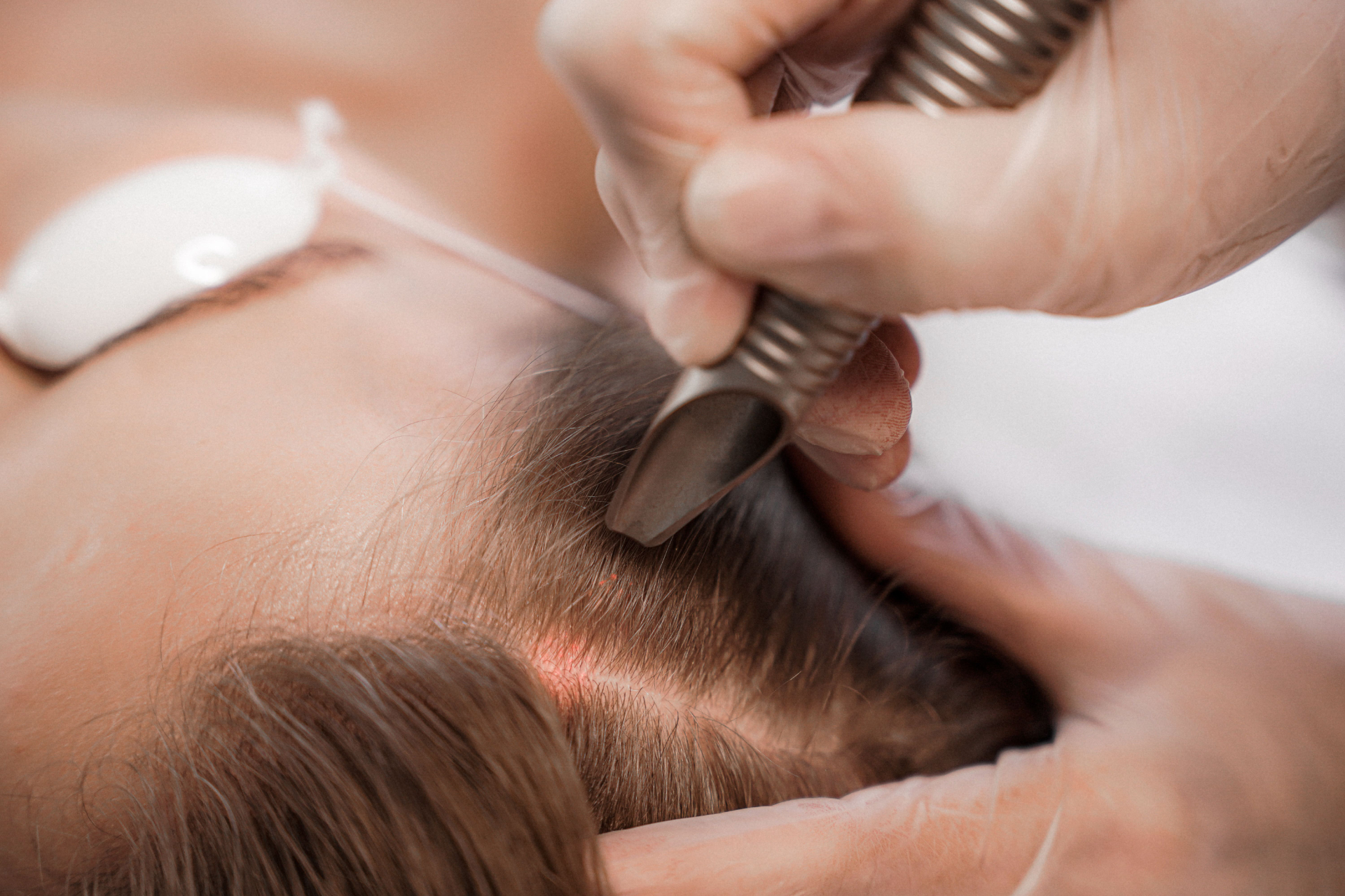 Пациент надевает защитные очки. Врач специальной лазерной насадкой обрабатывает всю поверхность кожи головы. Воздействие ощущается как приятное тепло. Процедура комфортна и полностью безболезненна.
